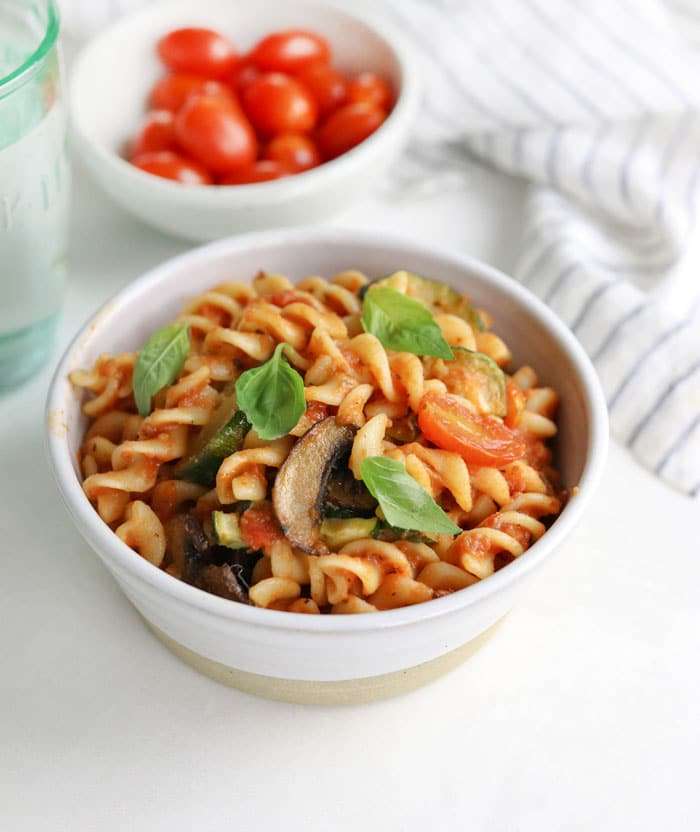 This Vegan Pasta is an easy vegetarian dinner made with just 5 ingredients. You need less than 30 minutes to make it!