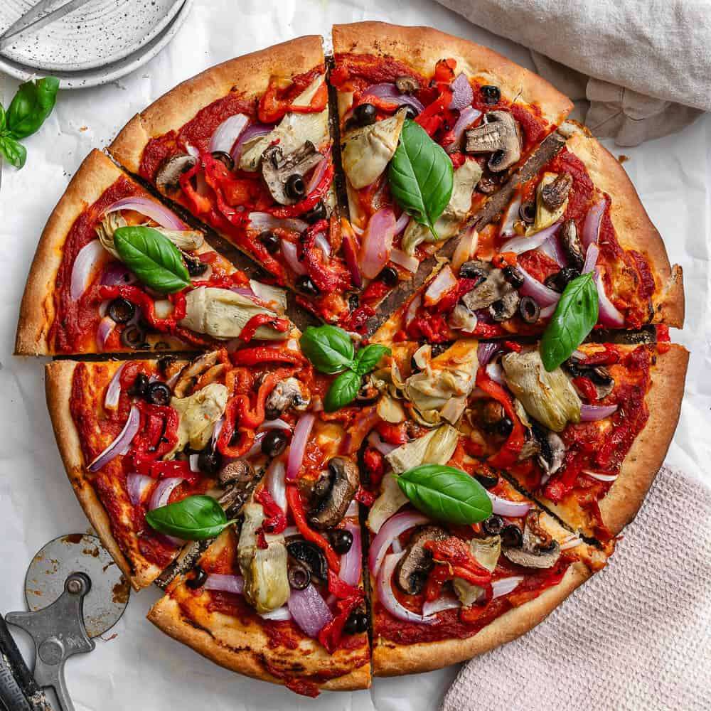Make easy vegan pizza dough at home with just 6 basic pantry ingredients in under an hour - by hand or in a stand mixer. Perfect for pizza night AND make-ahead and freezer-friendly!