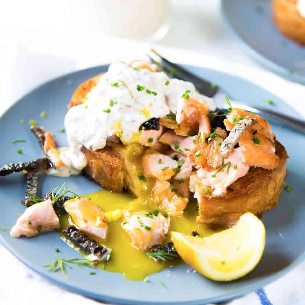 This egg in a hole with salmon and a spicy tartar sauce features warm, buttery toast with a rich runny egg in a hole, and topped with salmon and crispy skin! A delicious brunch or breakfast recipe and a great way to use leftover salmon.