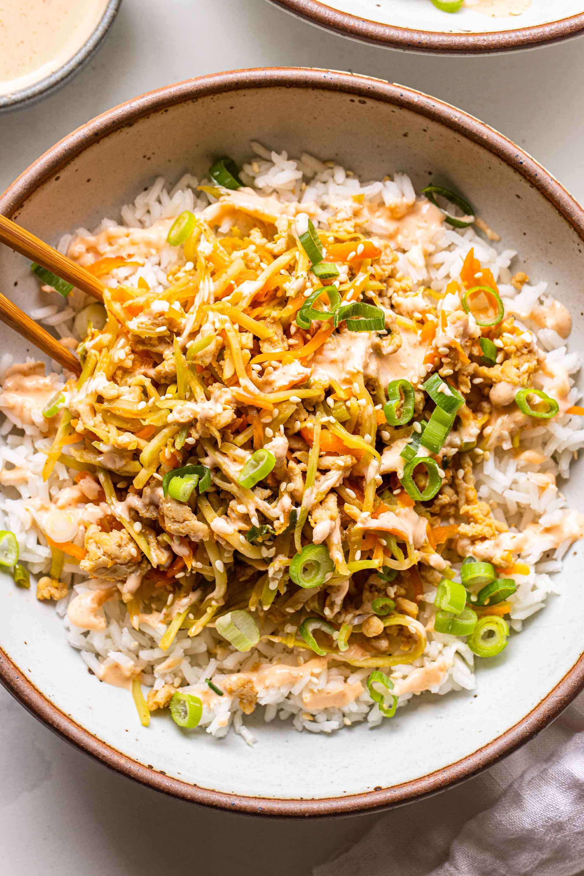 - Serve as is or on top of rice. Garnish with sesame seeds and green onions. Drizzle on the sriracha mayo.