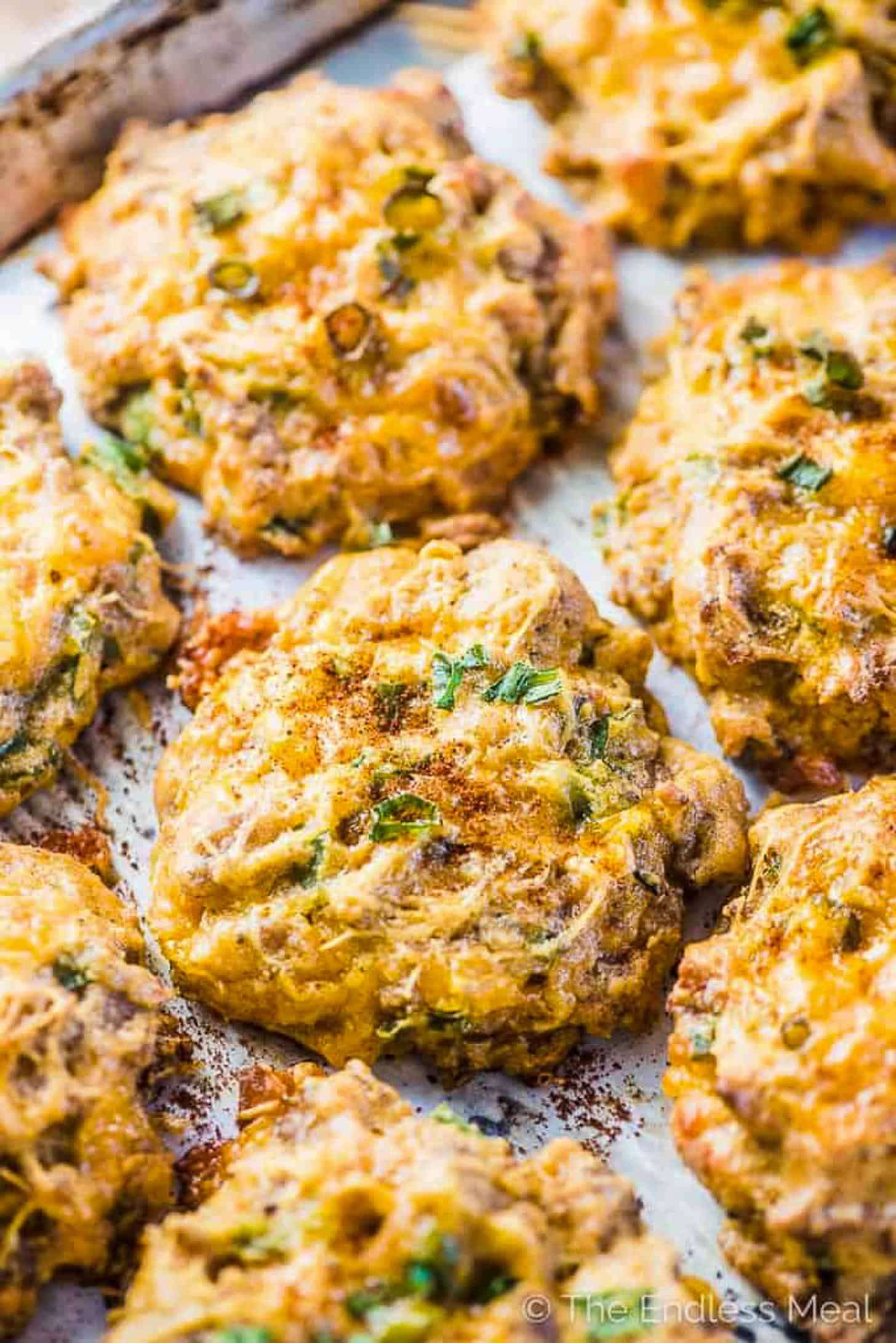 - Add the cooked sausage, eggs, almond flour, baking soda, green onions, and cheese to a bowl and mix well.