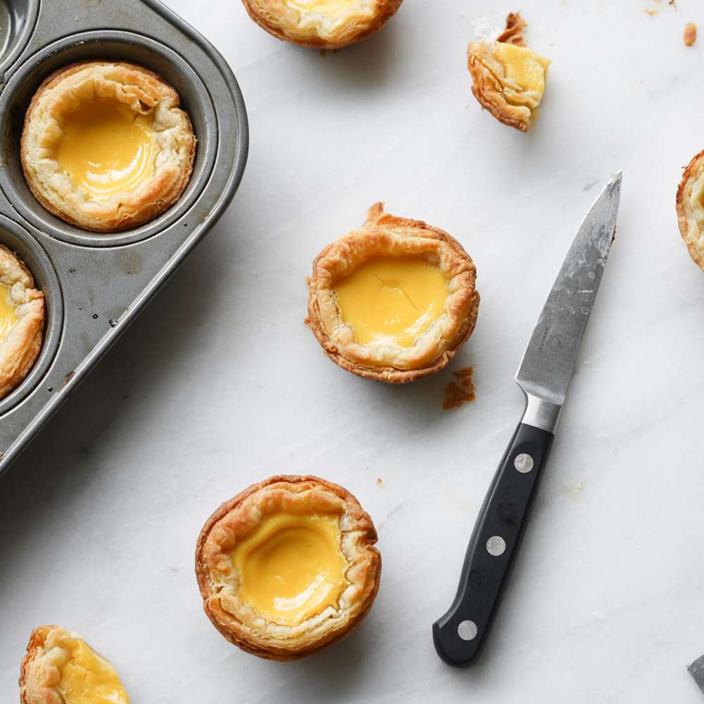 - Place your cupcake pan or egg tart molds on a sheet pan to help balance the tarts and for easy transportation. Place the tarts in the middle rack of the oven and bake for 10 minutes. At this point, the tart shells should rise and begin to brown on the edges, while the centers should be slightly jiggly.