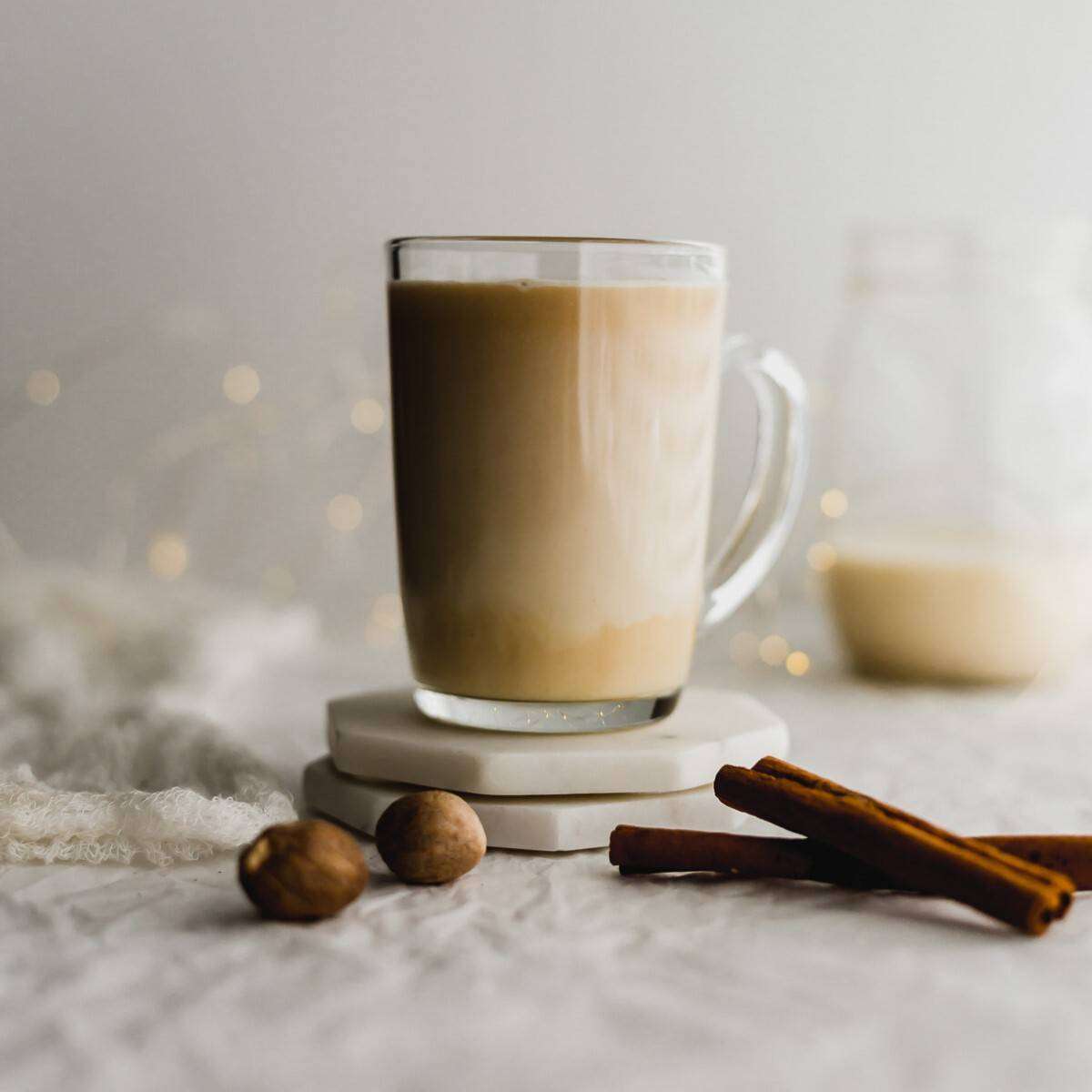 This simple recipe for Eggnog Latte features a creamy homemade eggnog, milk and espresso, making it a delicious festive drink.