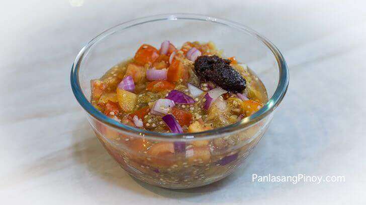 Ensaladang Talong or Eggplant Salad is a Filipino side dish composed of cooked mashed eggplant, fresh tomato, and onion with vinegar. Bagoong can be added for additional flavor. This makes a great side for grilled and fried dishes.