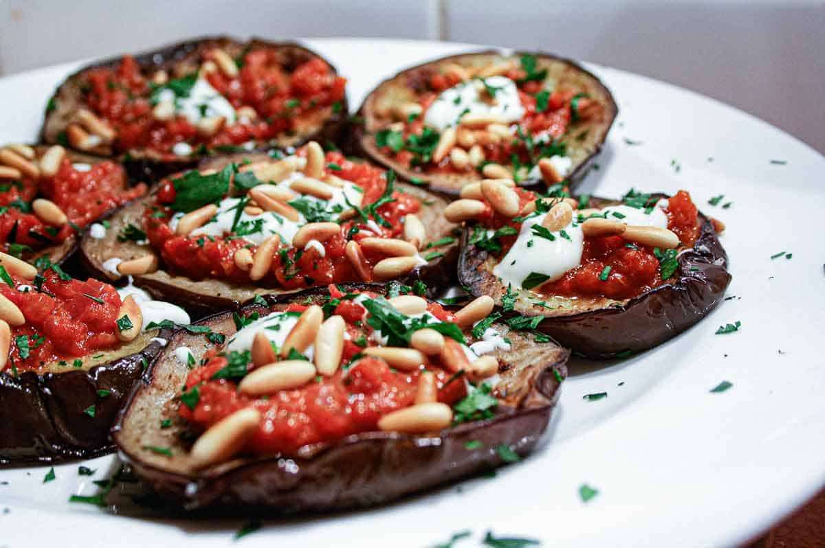 - When everything is at room temperature, arrange the eggplant in one layer on a platter. Add a spoon of tomato sauce on top, then a small dollop of yoghurt then sprinkle with parsley and pine nuts. Serve!