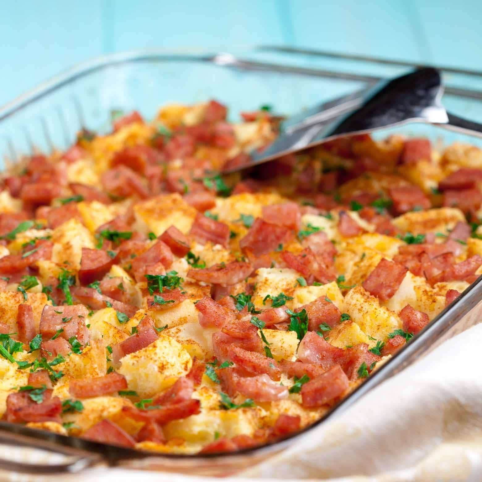- In a large bowl, whisk together the eggs, milk, onion powder, kosher salt, garlic powder, and black pepper. Pour evenly over top of casserole. Use spatula to gently press bread down to ensure even soaking. Cover tightly and refrigerate 2 hours or overnight.