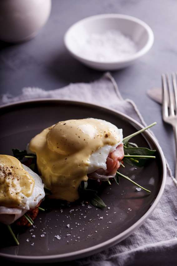 - To serve, top the hashbrowns with rocket, ham of your choice, poached eggs and finish with a generous spoonful of hollandaise.