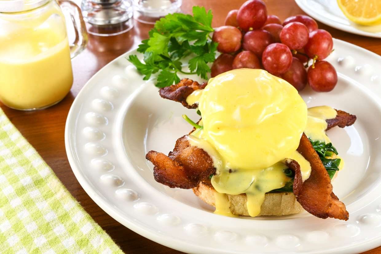 - Top with the drained poached egg, then finish by pouring some hollandaise sauce on top.