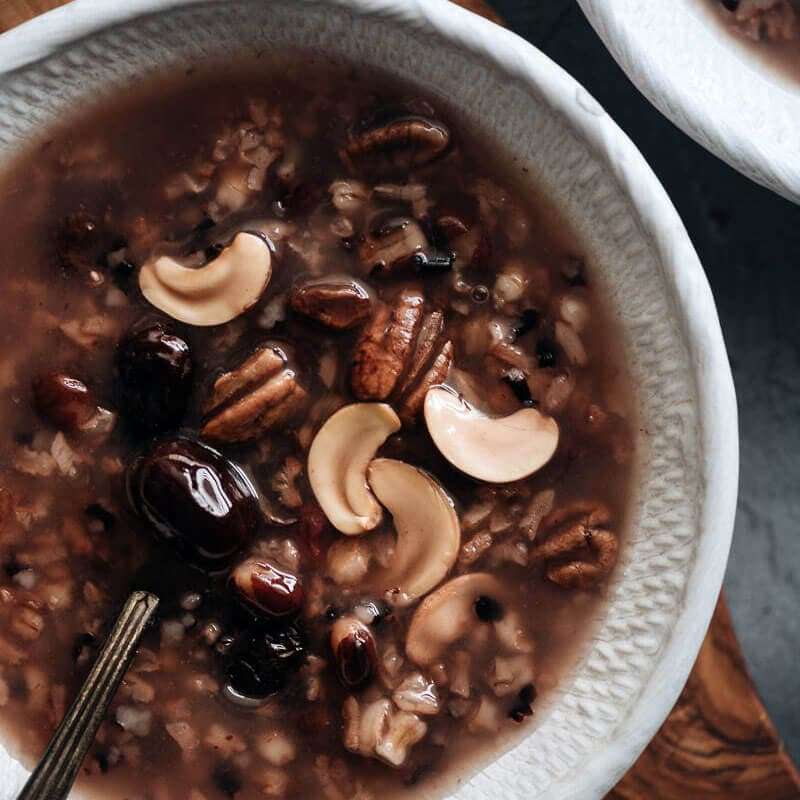 - Combine the glutinous rice, black rice, peanuts, walnuts, barley, red beans in a big bowl. Pour in 2”(5cm) tap water to cover. Soak overnight. Discard the soaking water and drain thoroughly before cooking.
