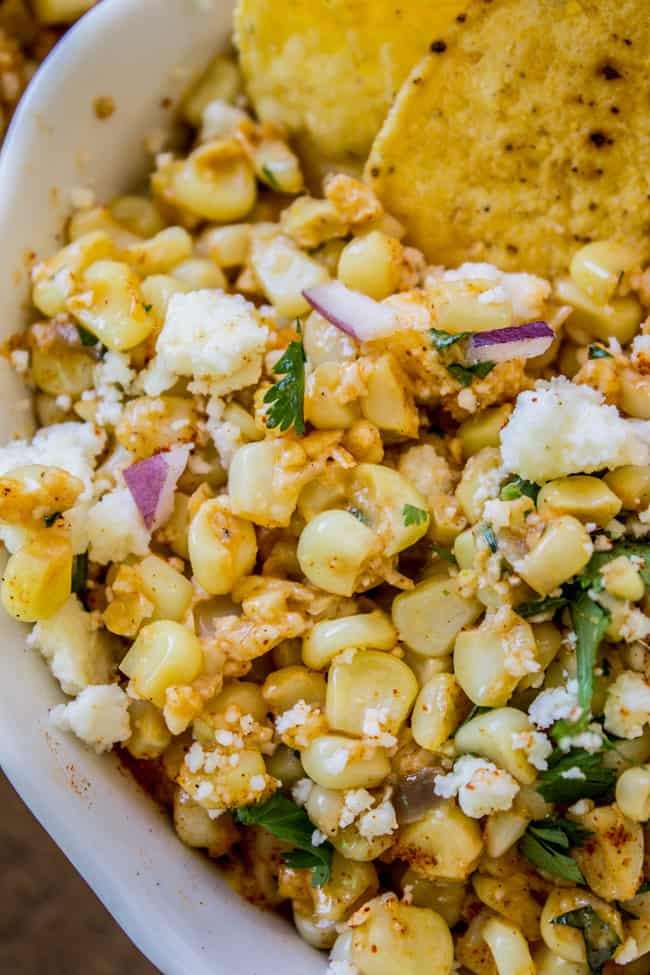 This Mexican street corn dip recipe tastes just like an elote (Mexican street corn). It is the perfect combo of sweet corn and savory tart cheese. Plus, it’s a lot easier to eat, AND you get tortilla chips. Win!
