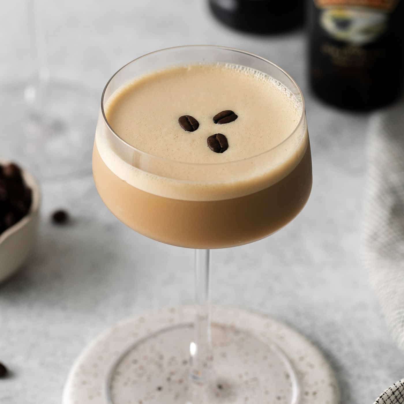 - Quickly strain the drink into a martini or coupe glass and then quickly garnish with the 3 coffee beans.