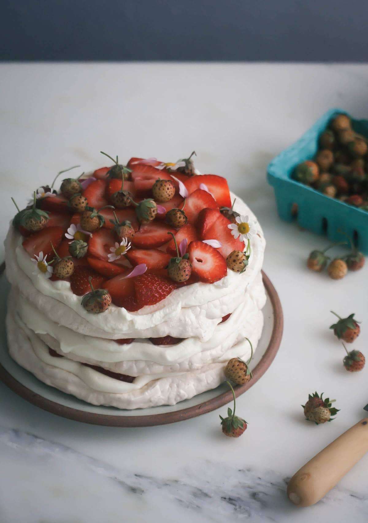 - Place the first meringue disk on a plate. Top with 1/4 cup of heavy cream (feel free to eyeball this measurement) and smooth it out until it reaches the edges. Top with strawberry slices. Repeat until you’ve made three layers. For the top, add more strawberries and garnish with chamomile leaves and baby strawberries.