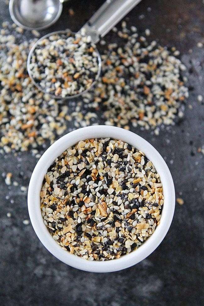 - In a small bowl, combine the poppy seeds, sesame seeds, dried garlic, dried onion, and salt. Stir until well combined. Store in a sealed jar or container.