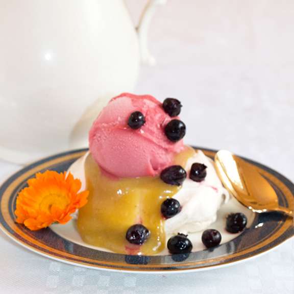- Top with a generous spoonful of fruit curd, a scoop of sorbet and fresh berries.