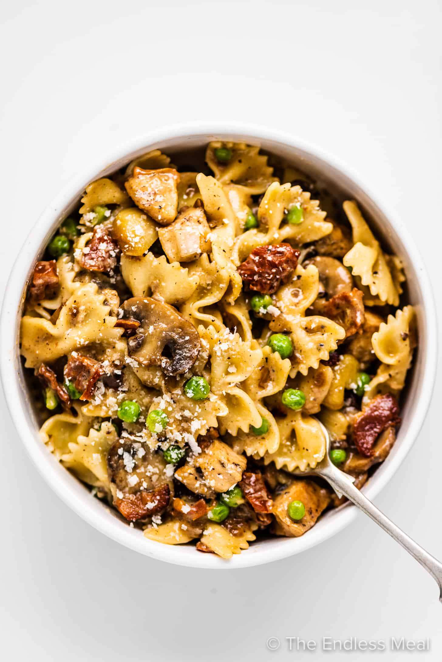 Farfalle with chicken and roasted garlic is a copycat Cheesecake Factory pasta recipe that is unbelievably tasty. Made with crispy bacon, tender chicken, sweet roasted garlic, sun-dried tomatoes, mushrooms, peas, and a light creamy sauce. It's perfect for when you want to treat yourself to a delicious splurge!