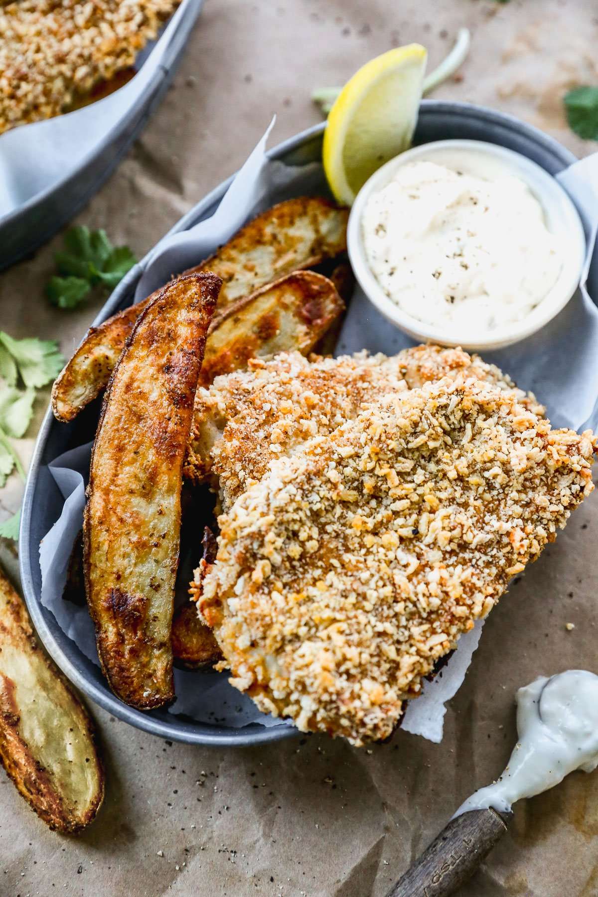 This recipe for baked fish and chips is a quick, healthy, one-pan meal. Panko breading makes the fish crispy outside and tender inside!
