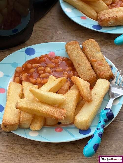 - When the air fryer beeps serve your fish fingers, chips, and beans.