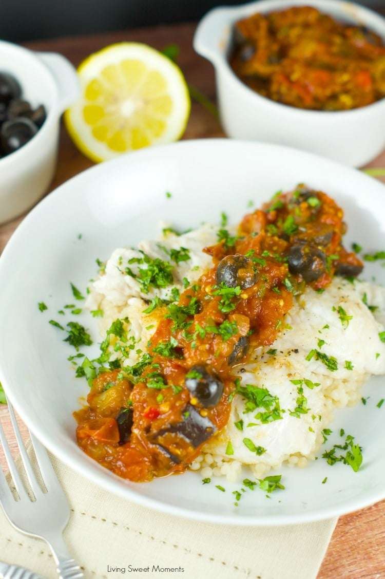 Fish With Eggplant Caponata Sauce: delicate white fish is paired with a robust roasted eggplant caponata sauce. Perfect for a weeknight dinner and parties.