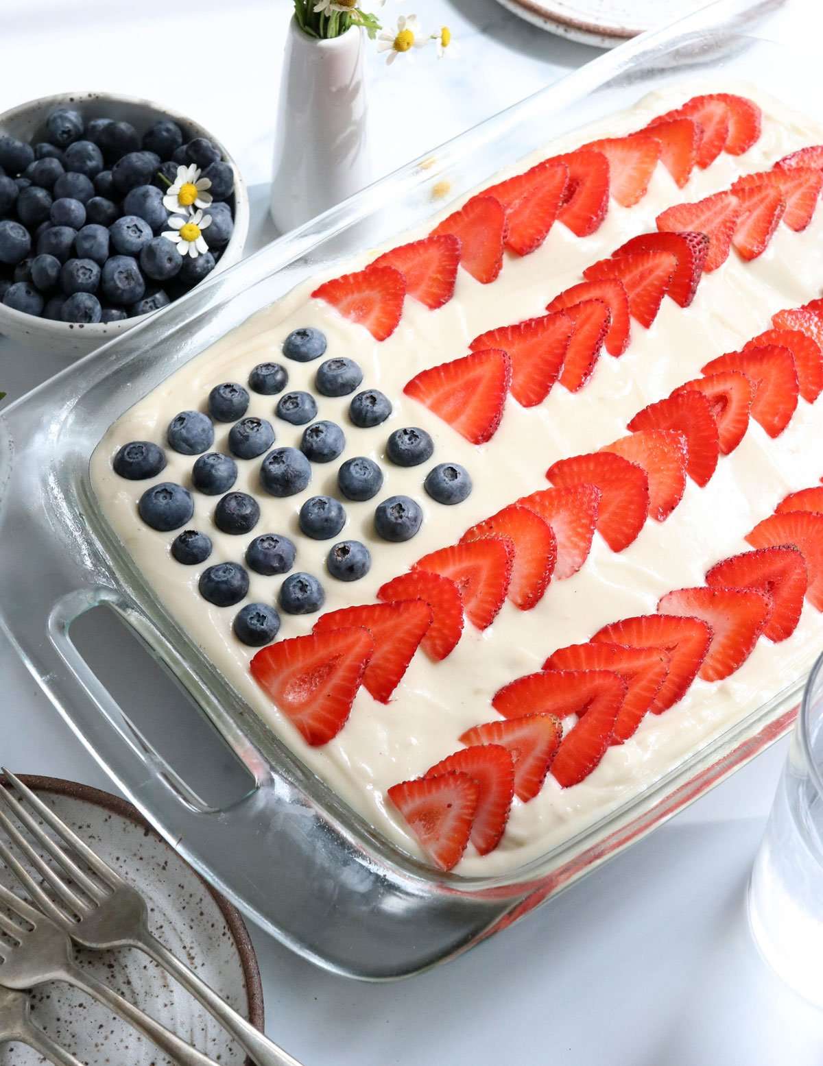 This patriotic cake is baked in a rectangular pan for a "flag shape" and then topped with fresh berries to look like an American Flag! It's perfect for Fourth of July, Memorial Day, or any summer party.