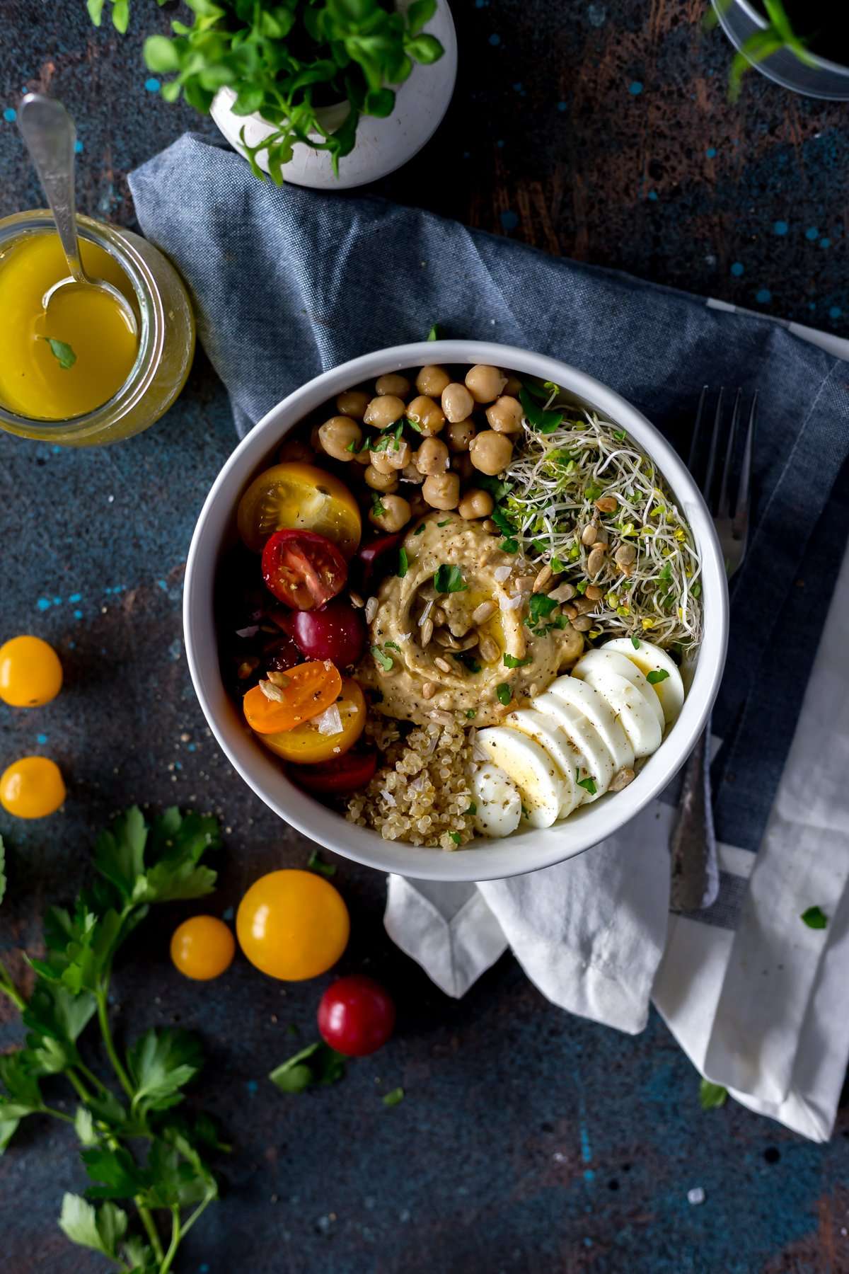 - In the bottom of a single-serving bowl, add the quinoa, followed by the chickpeas, tomatoes, sprouts, and hard-boiled egg. Spoon the hummus into the center, then sprinkle with sunflower seeds. Shake dressing, then drizzle over bowl. Serve immediately.