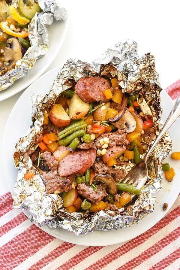 - Divide the ingredients among the four pieces of foil and place the food in the center of each piece, layering the butter, hamburger, and or sausage with the vegetables spices, herbs, and flavorings of your choice. Fold the two long edges toward one another and fold over once or twice then crimp tightly. Fold and crimp each short end of the foil toward the middle so that the edges are all tightly sealed.