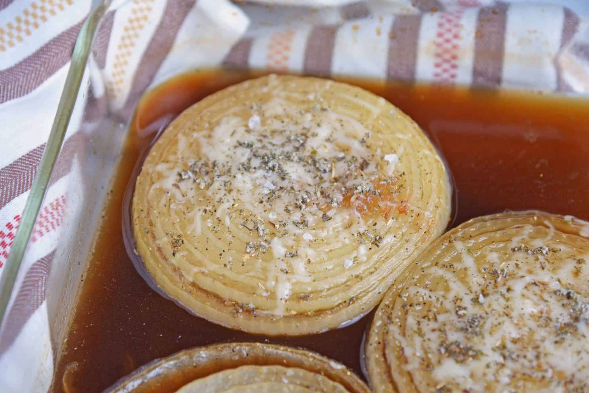 - Preheat oven to 300 degrees. Lightly coat a large baking dish with cooking spray. I use 9x13, however you could go slightly smaller. Onion halves need to lay in a single layer.