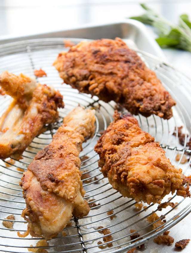 - As the chicken is done, remove the pieces and set them on the wire rack. Use a slotted spoon or strainer to skin the fat or oil of stray pieces of chicken, so they don’t burn, then fry the remaining pieces of chicken.