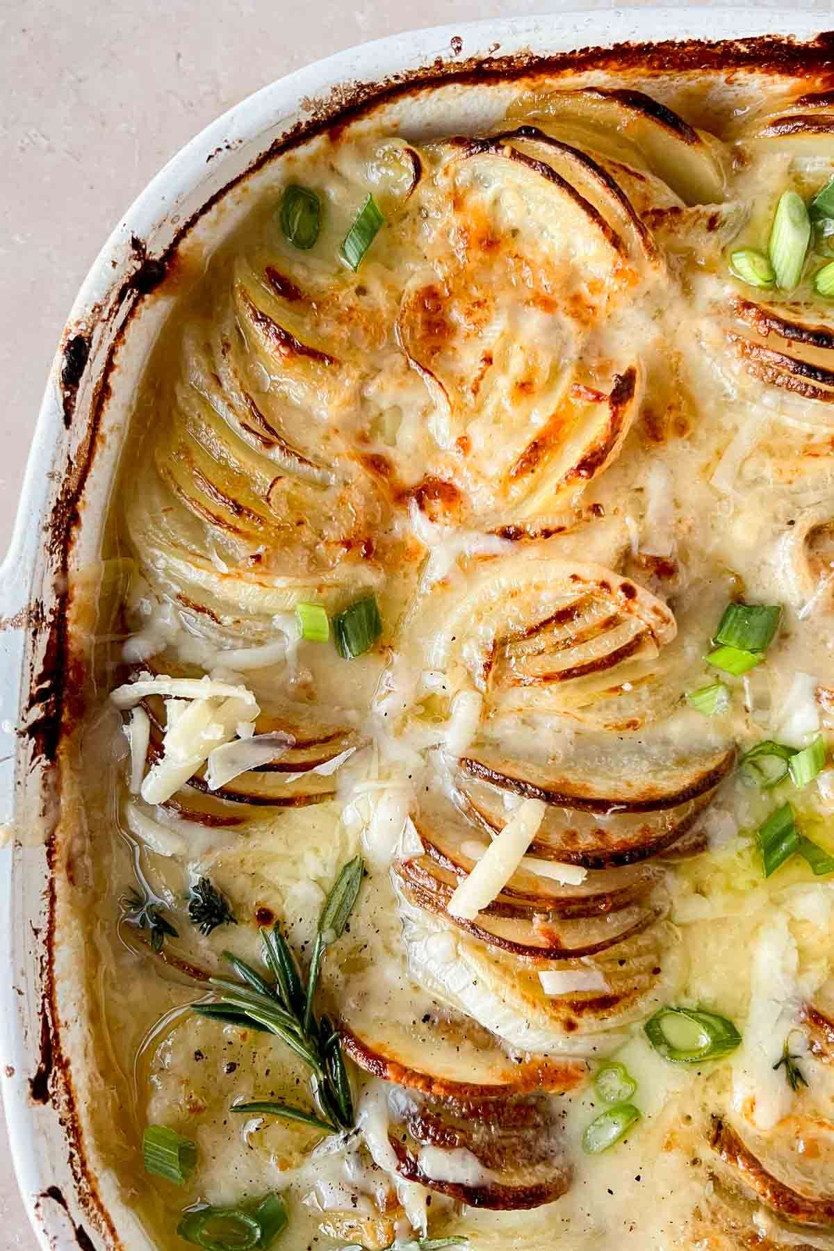 - Pour the onion cheese sauce over the sliced potatoes and onions, letting it seep between the layers. Use a rubber spatula to spread the cheese all over the potatoes / between the layers. Add the remaining shredded gruyere cheese on top.
