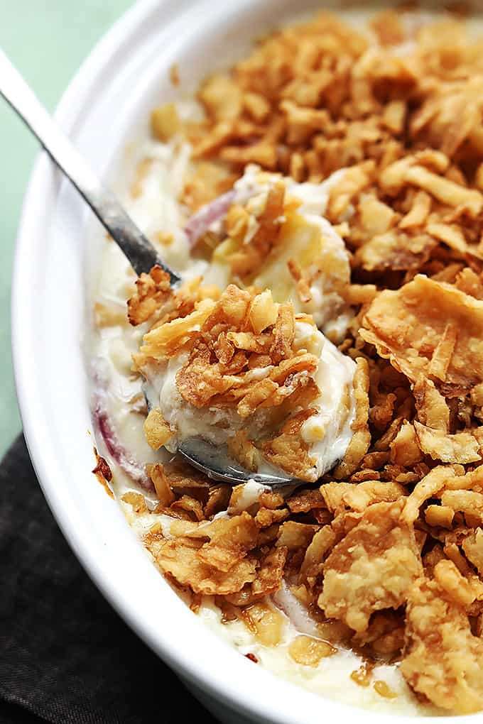 Creamy, cheesy scalloped potato casserole topped with crispy French onions.