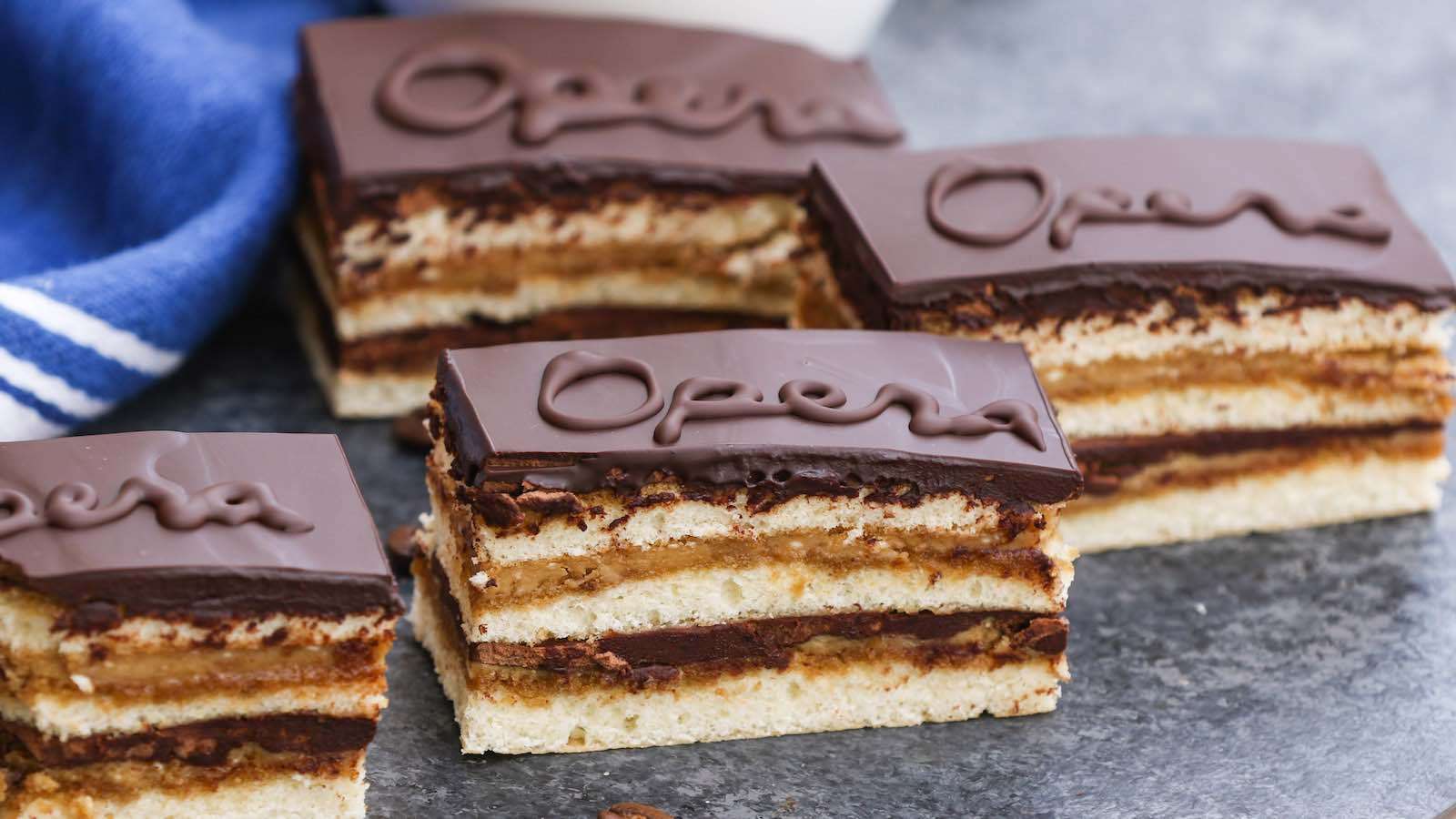 - Use the leftover chocolate glaze to write “Opera” on each piece. Serve and enjoy!