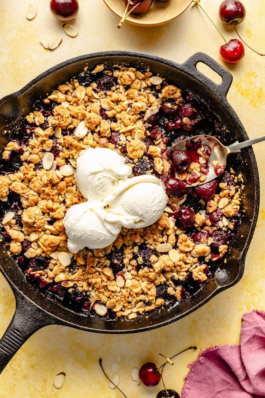 - Sprinkle the crumble topping evenly all over the cherries. Bake for 40-50 minutes until the filling is bubbling and the topping is nice and golden brown. Remove from the oven and allow to cool for 10 minutes before serving, then scoop into bowls and top with some vanilla ice cream! Or just enjoy it straight out of the pan! Serves 9.