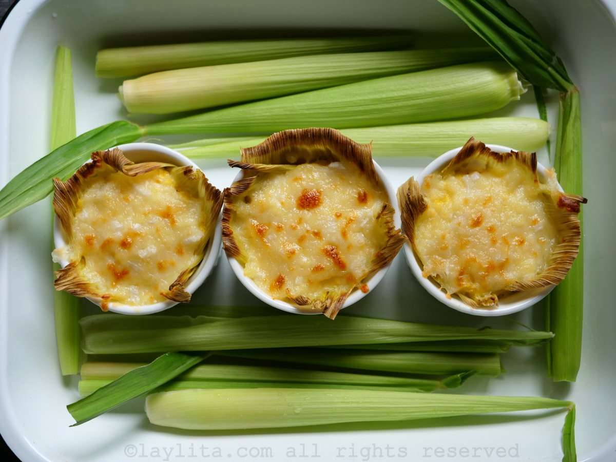 - Place the ramekins in rectangular baking dish filled with water, the water should reach about ½ to ¾ of the height of the ramekins. If you have extra corn leaves/husks you can add a few to the water, it will them that special humita smell when they cook.