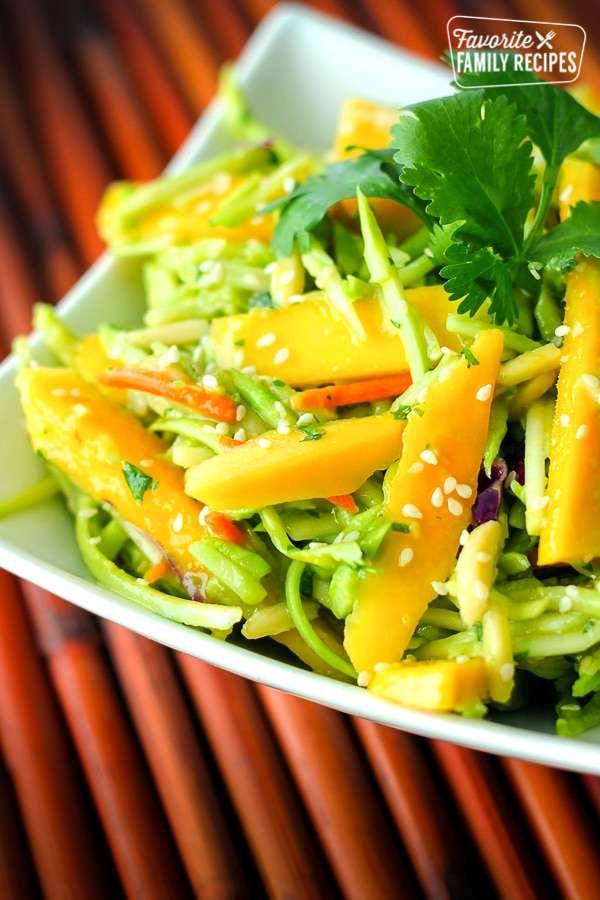 - In a large bowl, toss together the broccoli slaw, mangos, avocados, and almonds.