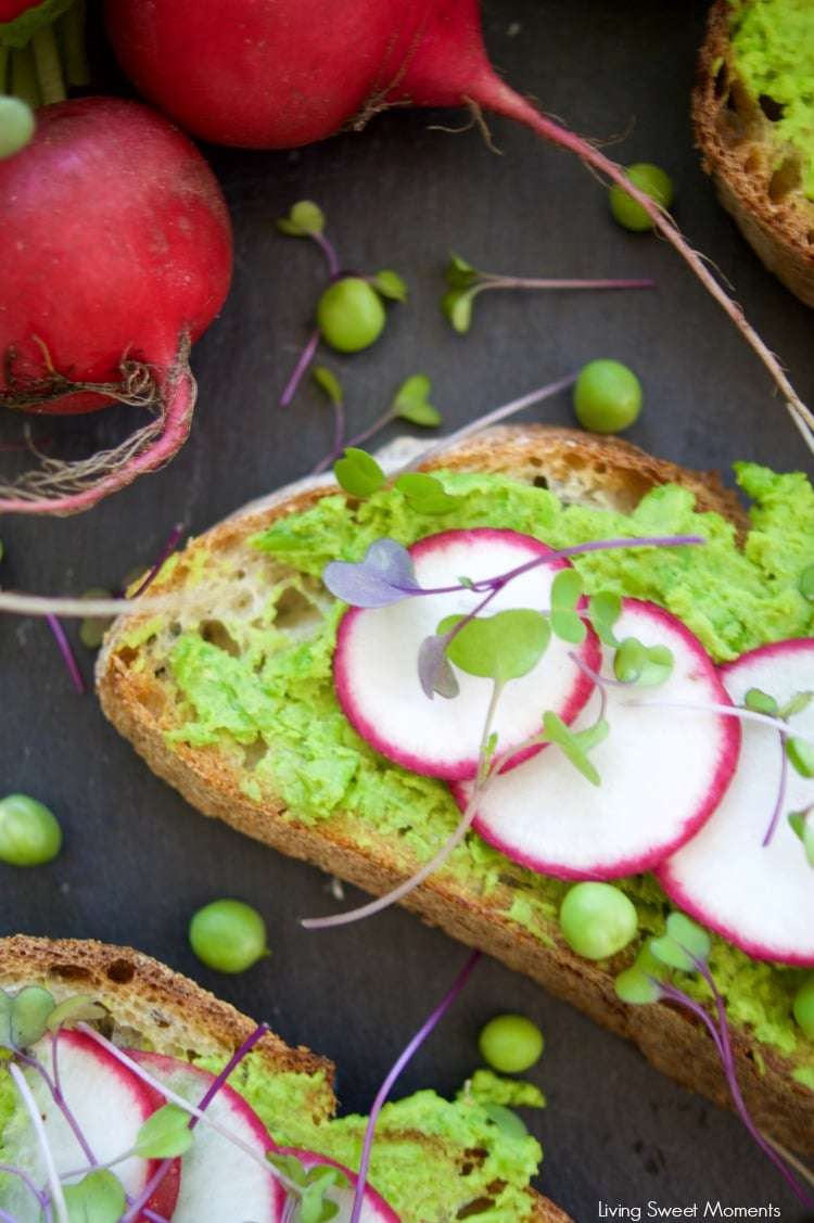 This delicious Pea Hummus Crostini recipe is easy and perfect for a Spring appetizer. Made with mint and tahini that gives a unique flavor. Vegan as well