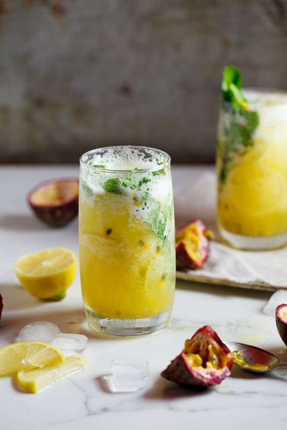 - To make the cocktail, fill glasse with ice, mint and lemon slices and top with passion fruit pulp.