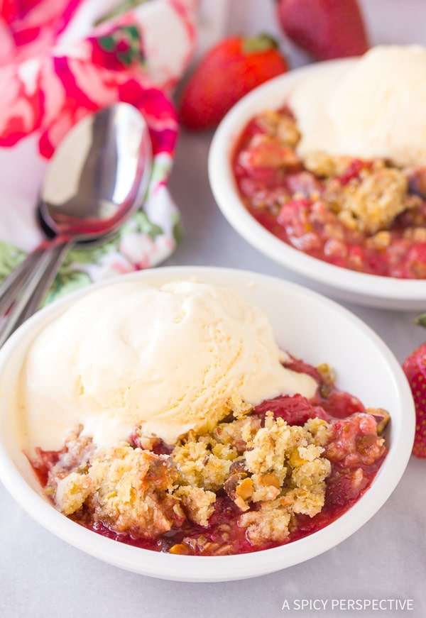 This bright blushing Fresh Strawberry Pistachio Crumble is the perfect summertime treat! It's an easy cobbler variation with an irresistible crumb topping!