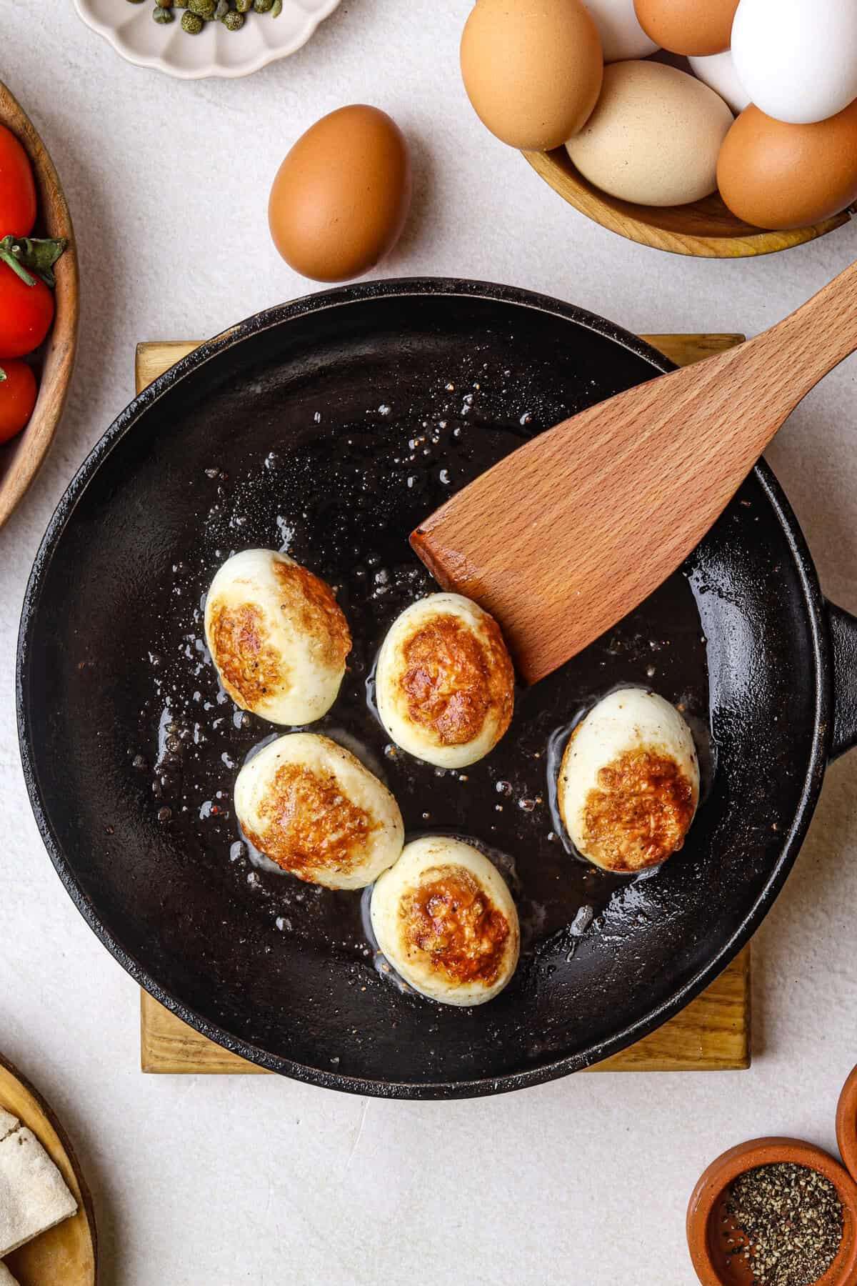 - Add the peeled, boiled eggs to the pan with the hot butter and fry on all sides until they are golden brown.