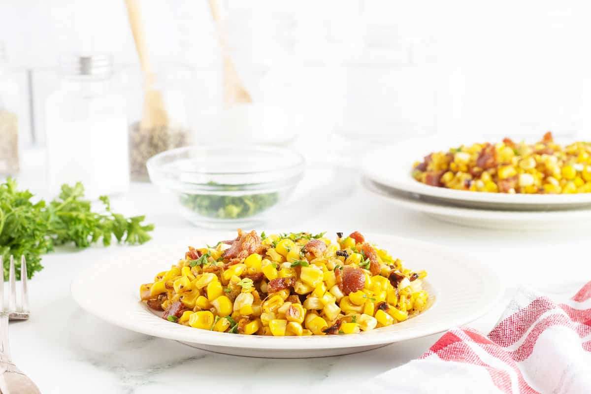Fresh corn kernels are scraped off the cob, then fried in a buttery bacon mixture for the absolute best corn you will ever taste!