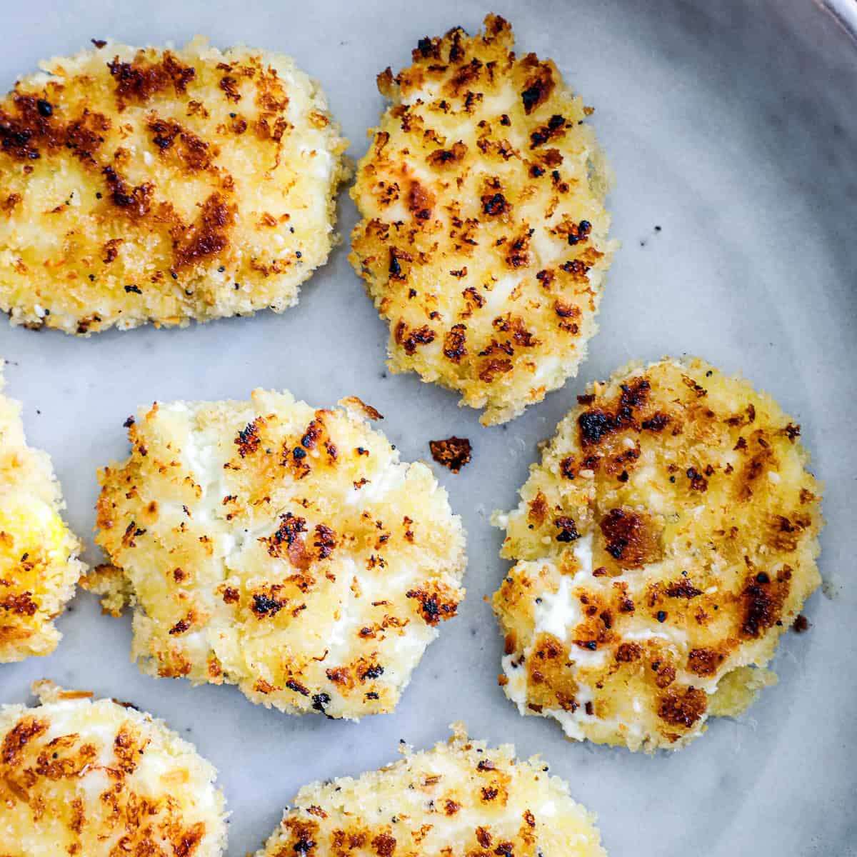 This crispy fried goat cheese is creamy and tangy on the interior and crisp on the outside perfect for an appetizer, snack, or salad topping.