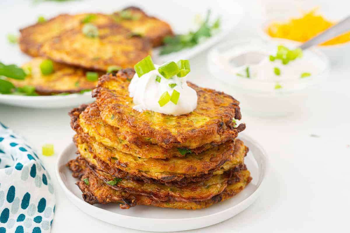 These zucchini fritters are loaded with two types of cheese, garlic and onion then fried to a golden, crispy perfection!