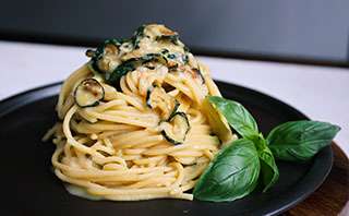 - Approx 1-2 minutes before your pasta is ready add the zucchini and basil prepared earlier to the pan and mix them around to slightly moisten them again.