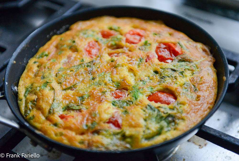 - Lower the flame and cover the skillet. Following the instructions in our post on How to Make a Frittata, proceed to cook the eggs on one side and then the other over a gentle flame.