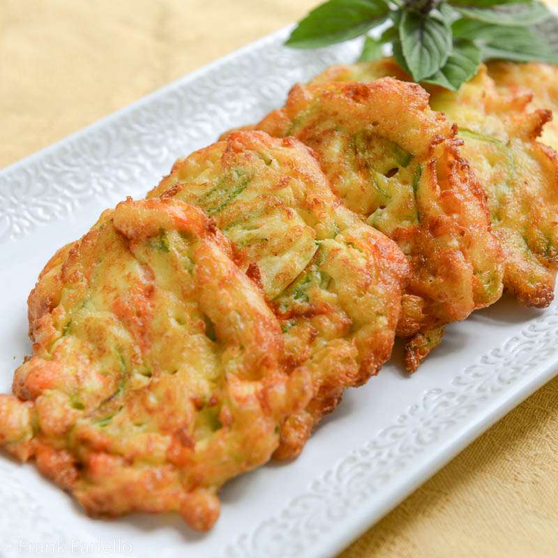 - In a large skillet, heat enough olive oil about 1cm (3/8 inch) deep until hot but not smoking. Add dollops of the batter by heaping spoonfuls into the oil and fry until cooked through and golden brown, about 2 minutes on each side.