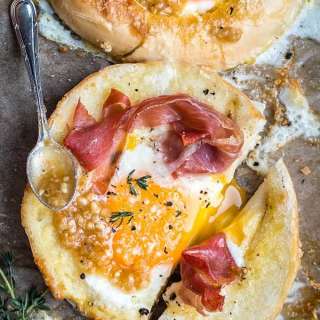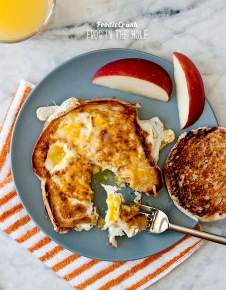 - Heat a fry pan on medium and spray with cooking spray and 1 teaspoon of butter. With the rim of a water glass or biscuit cutter, cut out the center of a slice of whole wheat bread. Place bread slice and remaining round in fry pan and crack 2 eggs in center of holed-out bread. Place a lid over the pan and cook for 2 minutes or so. As eggs set and whites become cooked, flip bread and egg with turner, also turning bread round. Add shredded cheese to top of egg and bread, cover to cook and melt until eggs are cooked as desired. Serve with fresh fruit. For the adults, I serve with Chohula or salsa and sour cream for a little kick.