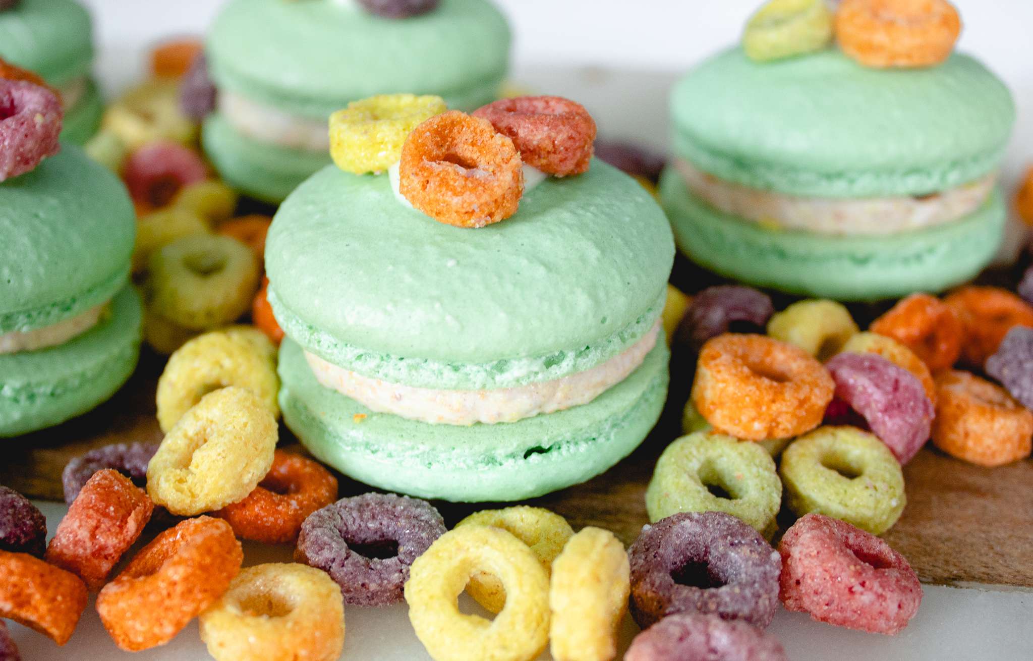 These Froot Loops Cereal macarons are an indulgent and nostalgic take on the classic French Macaron. The macarons are made with a plain shell, filled with a cereal flavored Swiss Meringue buttercream, and topped with more cereal!