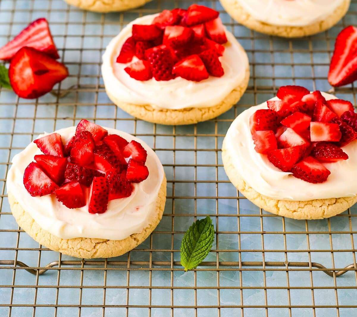 - Cut the strawberries into small pieces or into slices, depending on preference. Arrange the sliced strawberries on top of the frosted cookies or sprinkle the fresh strawberries over the frosting.