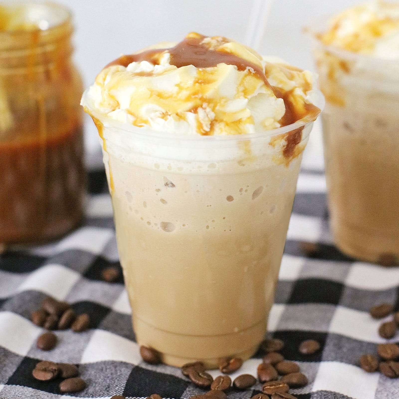 - Pour into two 12 ounce glasses, top with Whipped Cream, and drizzle caramel sauce on top. Serve, and Enjoy!