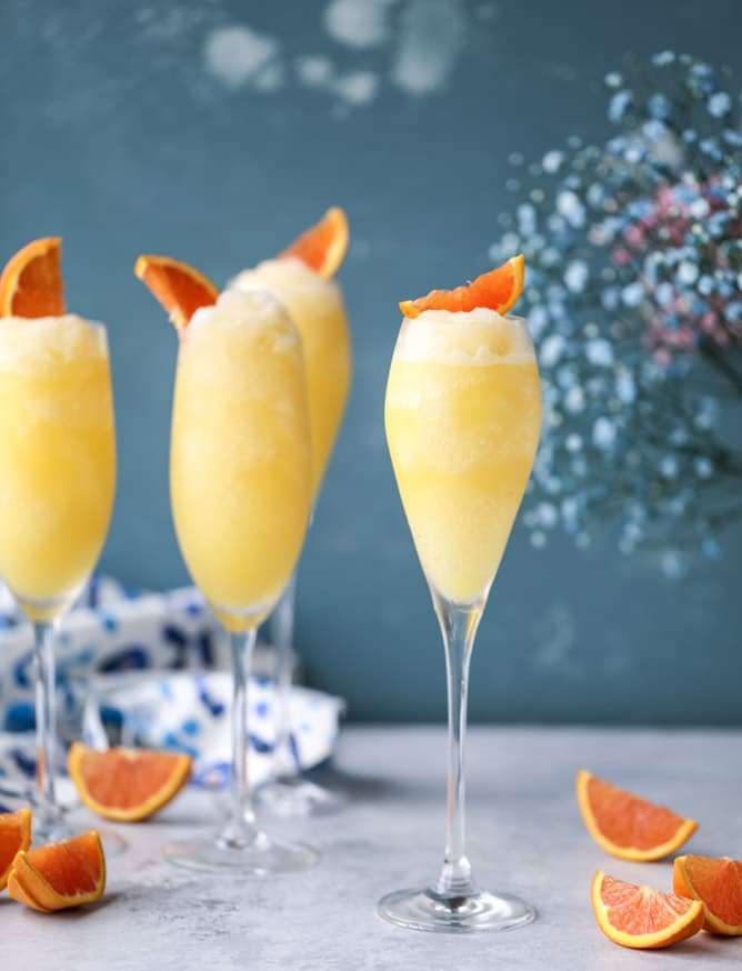 - The next morning, add your orange juice ice cubes and your champagne/wine to a blender and blend until frosting. If the mixture is too liquidy, you can add a few extra (regular) ice cubes!