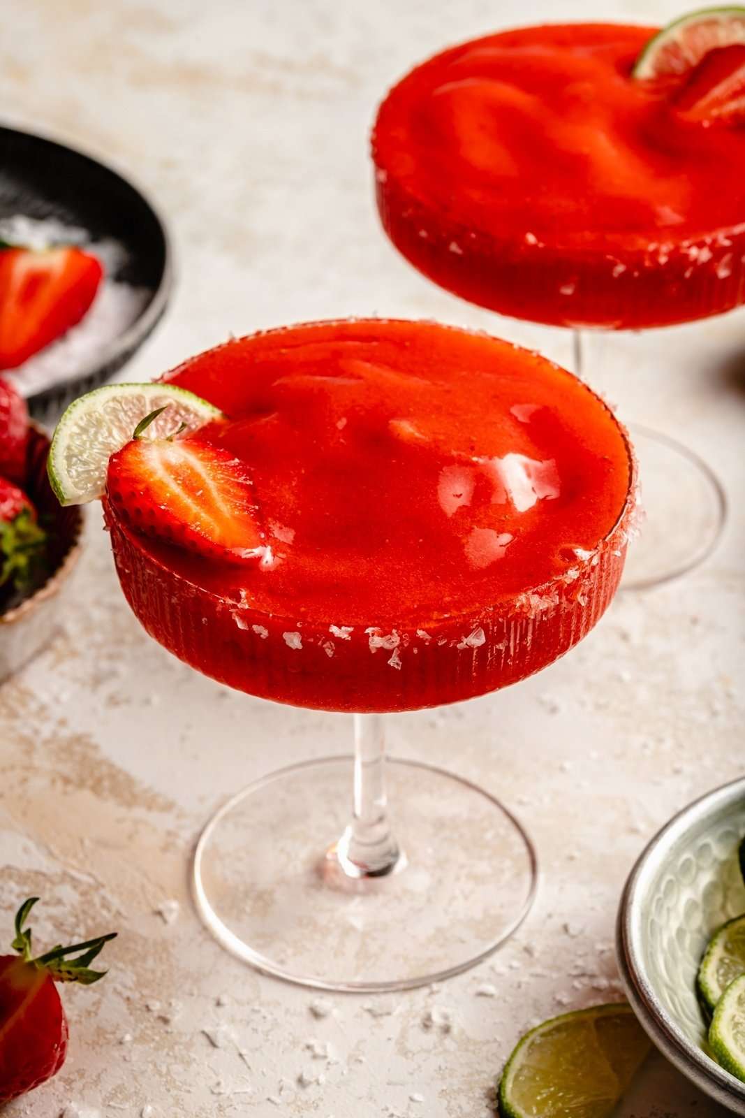- Pour into the rimmed glasses and garnish with strawberries if desired. Serves 2-3. Cheers!