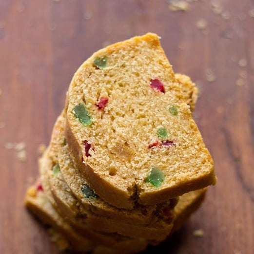 - Cut the bread in equal slices. These Fruit Bread slices go well with tea or coffee. You can even slather some butter (vegan or dairy) or jam and have them.